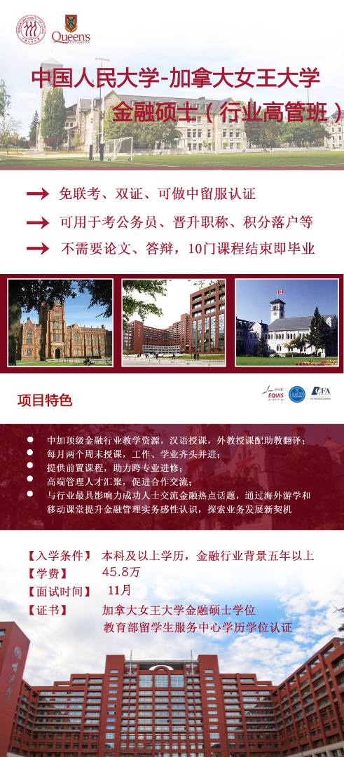 中国人民大学与加拿大女王金融硕士学校自主招生 中留服认证 可积分落户一.院校介绍中国人民大学(Renmin University of China,RUC)是国家人文社会学科的领头雁。在教育部学位评估中心2016年初公布的新一轮学科评估结果中,人民大学的金融学、理论经济学、应用经济学等九个学科排名全国第一,在人文社会科学领域位居全国高校之首。加拿大女王大学(Queen’s University)依照维多利亚女王的皇家宪章于1841年建立,被公认为是加拿大顶尖学府之一,对加拿大的高等教育影响深远。女王大学与麦吉尔大学、多伦多大学共称“加拿大常春藤盟校”。二.项目特色1、中加顶级金融行业教学资源、汉语授课,外教授课配助教翻译;2、每月集中授课一次,工作、学业齐头并进;3、证书全球认可,而且可在教育部留学服务中心进行中外合作办学学历认证4、高端管理人才汇聚,促进合作交流;5、与行业最具影响力成功人士交流金融热点话题,通过海外游学和移动课堂提升金融管理实务感性认识,探索业务发展新契机。6、不脱离国内环境,就业更能“接地气”三.课程设置模块一:全球化背景下的金融管理实务模块二:资本市场投资实践模块三:综合领导力模块四:前沿热点话题讨论及政策解读预科课程四、招生对象:1. 具有经济学、金融学以及相关学科学习基础2. 具有学士学位(专业不限)3. 具有七年以上金融行业从业经验的在职专业人士、管理人员。五、学制及学费1、金融硕士项目学制一年六个月,每月集中授课四天(周四至周日)共30学分(共10门课,每门课3学分)。2、项目学费458000元,含教材和上课材料费。六.颁发证书 修满学分且符合毕业要求的学员将获得由中国人民大学颁发的结业证书(在中国人民大学的培训项目网站可查),以及由加拿大女王大学颁发的金融硕士学位证书,该证书全球认可,而且可在教育部留学服务中心进行中外合作办学学历认证。教育部推荐和认证院校,学位全球认可。可用于学历提升、丰富履历、形象提升、考公务员、考博士、职称评选、面试跳槽、增竞争力、人脉拓展、能力提升、机会增加、升职加薪、北上广深等大城市积分落户、海外升学、海外融资、海外就业、海外移民、彰显身份、上市披露等诸多实际用途。加微时请注明:姓名+人大女王金融硕士报名咨询联系人:徐老师 13651129768微信号;pku0618在线QQ: 594729835