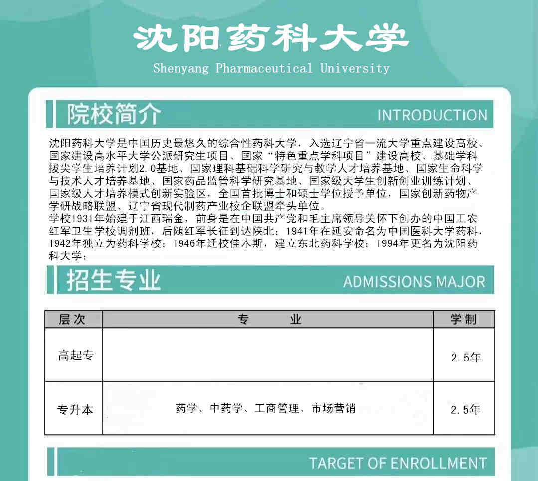 沈阳药科大学成人高等教育函授专升本科学历(托管)招生简章学历层次:本科(专升本)学历类型:成考,函授形式一、【学校简介】:沈阳药科大学是中国历史悠久的综合性药科大学,入选辽宁省一流大学重点建设高校、国家建设高水平大学公派研究生项目、国家“特色重点学科项目”建设高校、基础学科拔尖学生培养计划2.0基地、国家理科基础科学研究与教学人才培养基地、国家生命科学与技术人才培养基地、国家药品监管科学研究基地、国家.级大学生创新创业训练计划、国家.级人才培养模式创新实验区,全国首批博士和硕士学位授予单位,国家创新药物产学研战略联盟、辽宁省现代制药产业校企联盟牵头单位。学校1931年始建于江西瑞金,前身是中国工农红军卫生学校调剂班,后随红军长征到达陕北;1941年在延安命名为中国医科大学药科,1942年独立为药科学校; 1994年更名为沈阳药科大学。二、【专业设置】:专科起点本科:药学、中药学、工商管理、市场营销三、【报名条件】:报名专科起点本科者,需具有国民教育系列(学信网可查)的专科及以上学历,如前置学历为2001年以前毕业生,需提供教育部学信网下载的学历认证报告。四、【学习及教学】:通过入学测试并被录取的学生,按照所报考专业的课程计划完成即可。具体完成方式咨询招生老师。五、【报名时间】:每年一次报考,报名截止时间以院校招生名额计划为准,满额即截止。六、【报名材料】:本人身份证扫描件一份;近期蓝底高清照片一份;前置学历毕业证扫描件一份;七、【报考及有关问题咨询】:田老师:1 7 6 0 0 2 8 3 9 8 5 (电 话/微 信)Q Q: 2 6 0 7 0 2 7 6 9 8沈阳药科大学成考函授专升本学历报考简介