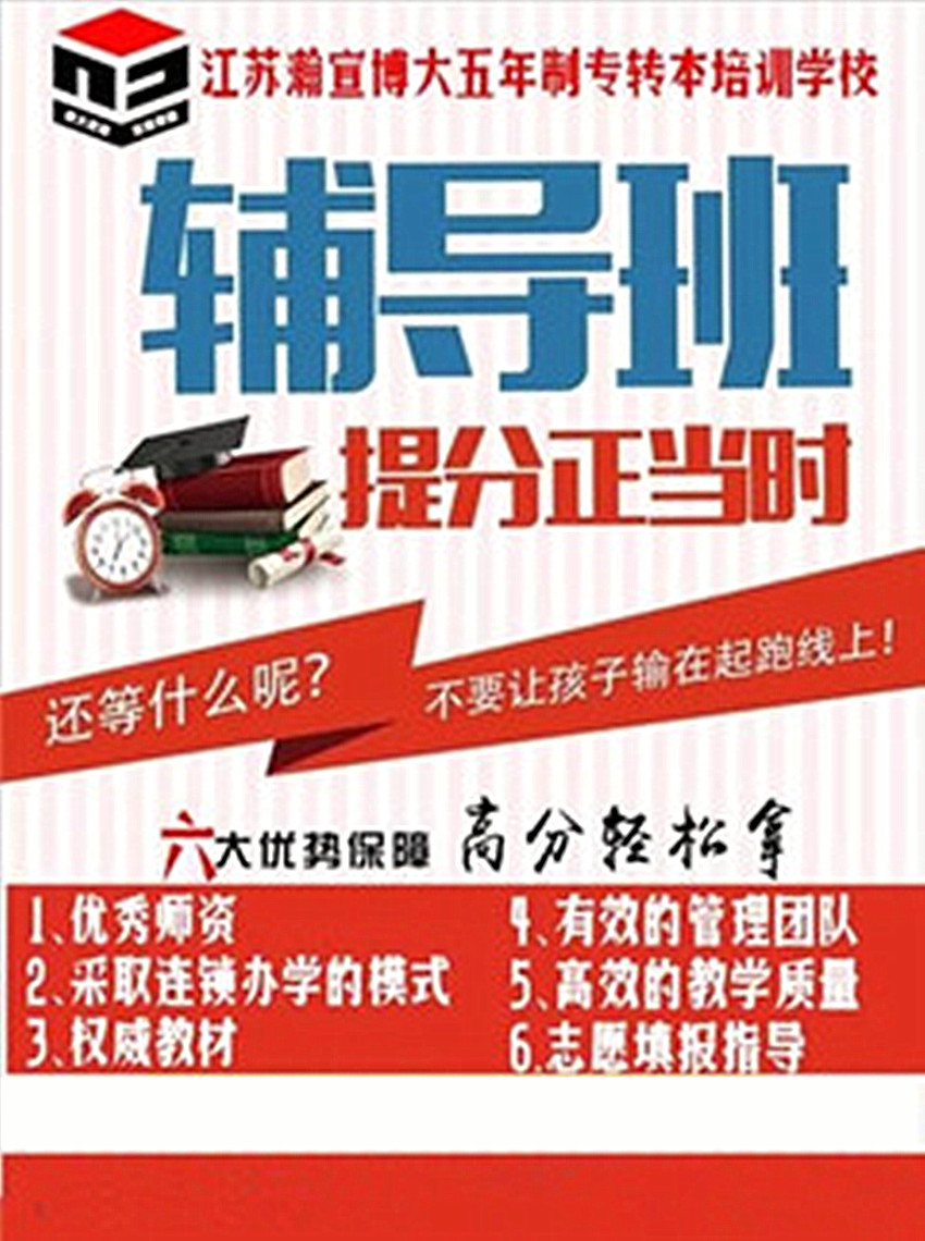 五年制专转本的备考中很多家长和学生也会走进一个误区,就是英语专业课不知道哪个难,哪个拉分严重,申老师着重给大家分析一下,五年制专转本考试中,英语是至关重要的,因为五年制的高职生没有上过高中,缺少了三年高中的英语学习,虽然高职也会教英语,但基本上五年制高职院校到3、4年级就会停止上英语课,时间一长,很多学生就把之前学习的知识给忘光了,而且高职学校的英语考试是有考察范围,不足以应付转本考试,基本上高职生偏科也是英语,也是拉分较大的科目,需要提前有针对的学起来。所以五年制专转本的备考就是越早进入复习状态就越轻松,通过率越高,很多学生其实很早已经了解了五年制专转本,但是都是想等到第五年再开始报班培训,对于这部分同学,我要说的是不要过于盲目自信,必须给自己留下充足的备考时间,想要提高必须夯实基础,这不是一朝一夕就能完成的,尤其是英语这门学科,根本不可能在两三个月之内就有明显效果。两门专业课侧重于本科水平,与高职期间所学专业的侧重点是有所差别的,想要成功转本也有一定的难度;实际上专转本备考没有什么技巧,无非就是看谁先备考赢在了起跑线,或者说花了更多的精力和努力了,因此很多五年制专转本备考生及家长都会选择一个专业的五年制专转本培训辅导班,跟着专业的老师针对性备考复习,省去自己花时间找资料,自己纠结选择哪所院校的过程,安心学习不好吗?其实想要成功转本并不是你想的那么困难!选择专转本培训班应尽量选择大的连锁机构,大机构资质好,在各方面投入的精力多,因为大的专转本机构有信誉,不糊弄学生,江苏瀚宣博大专转本培训学校所有校区欢迎大家试听,先试听后报名!学生和家长在选择专转本培训班时,别贪图便宜,所谓一分钱一分货,名气大的专转本培训班在价格上可能看上去贵些,但可以肯定,无论是信誉还是教学资质都是有保证的。江苏瀚宣博大专转本学校是江苏省的一家线下大型连锁五年制专转本培训机构,18年辅导经验,规模大连锁办学,师资雄厚,通过率高,历年来帮助了上万五年制专转本考生成功转本。根据考生的不同基础情况提供五年制专转本考试政策的专业咨询、各大主考院校的详细介绍、统考英语的辅导、专业课精准考纲提供、专业课的教学、统一报名、集体送考、通过率更高的志愿填报等一系列流程化服务,让考生对五年制专转本的了解更加深入,更加有方向性和针对性,更多五年制专转本详情及预约免费试听可联系瀚宣博大顾老师。招生对象:参加2026年、2027年、2028年五年制专转本考试的五年制高职在校生。五年制专转本课程特色:瀚宣博大专转本辅导班教学以来,拥有靠谱教材、科学的教学模式、完善的课堂服务、针对性模拟试题等教学特色。五年制专转本的上课模式:周末、暑假、寒假、考前、全日制教学,考式复习,模拟高三备战高考复习状态,营造积极的学习气氛。徐州、镇江、常州、无锡、盐城、南京、南通、扬州、淮安、苏州等都有分校,外地学生可根据自己情况需选择不同的城市。江苏专转本每个人都只有一次机会,还希望大家能够抓住这次机会,成功上岸!